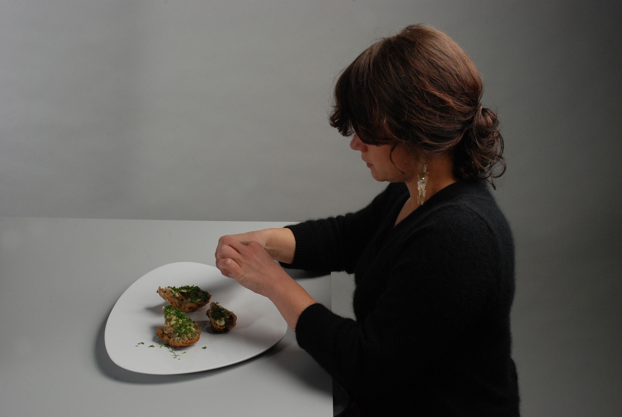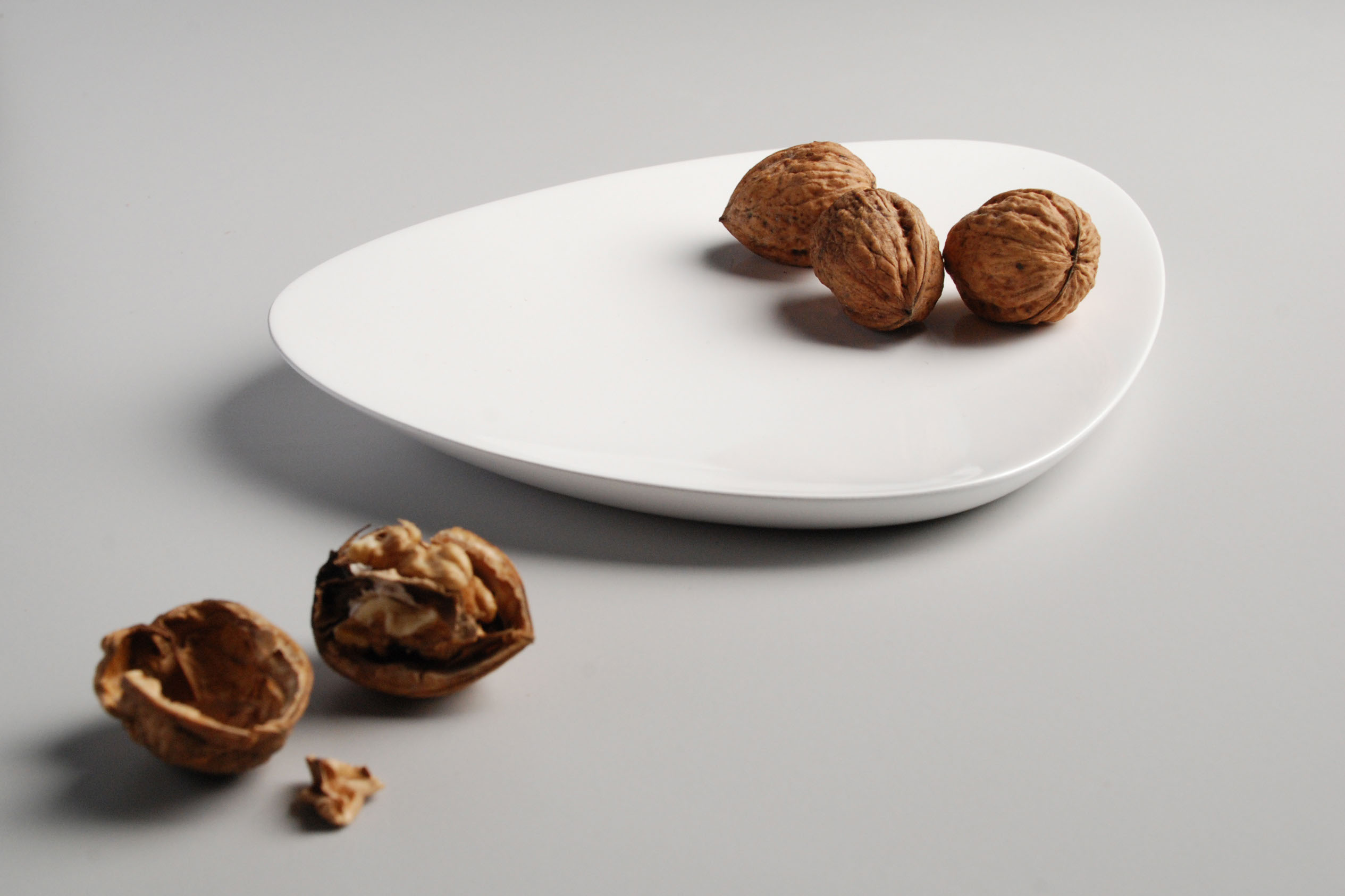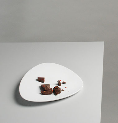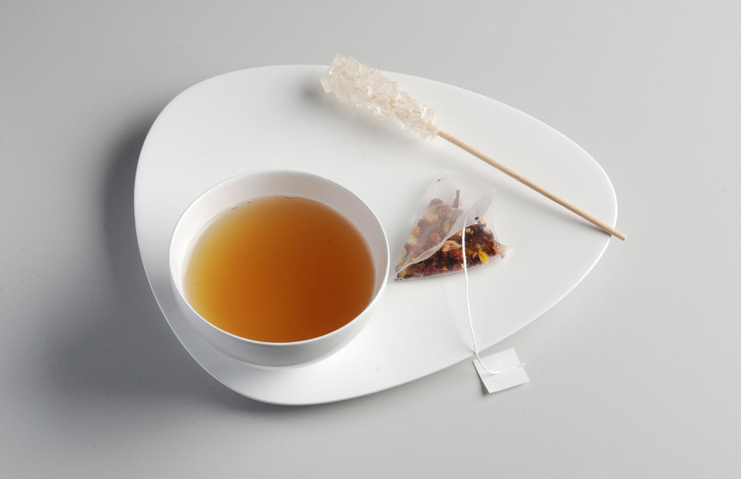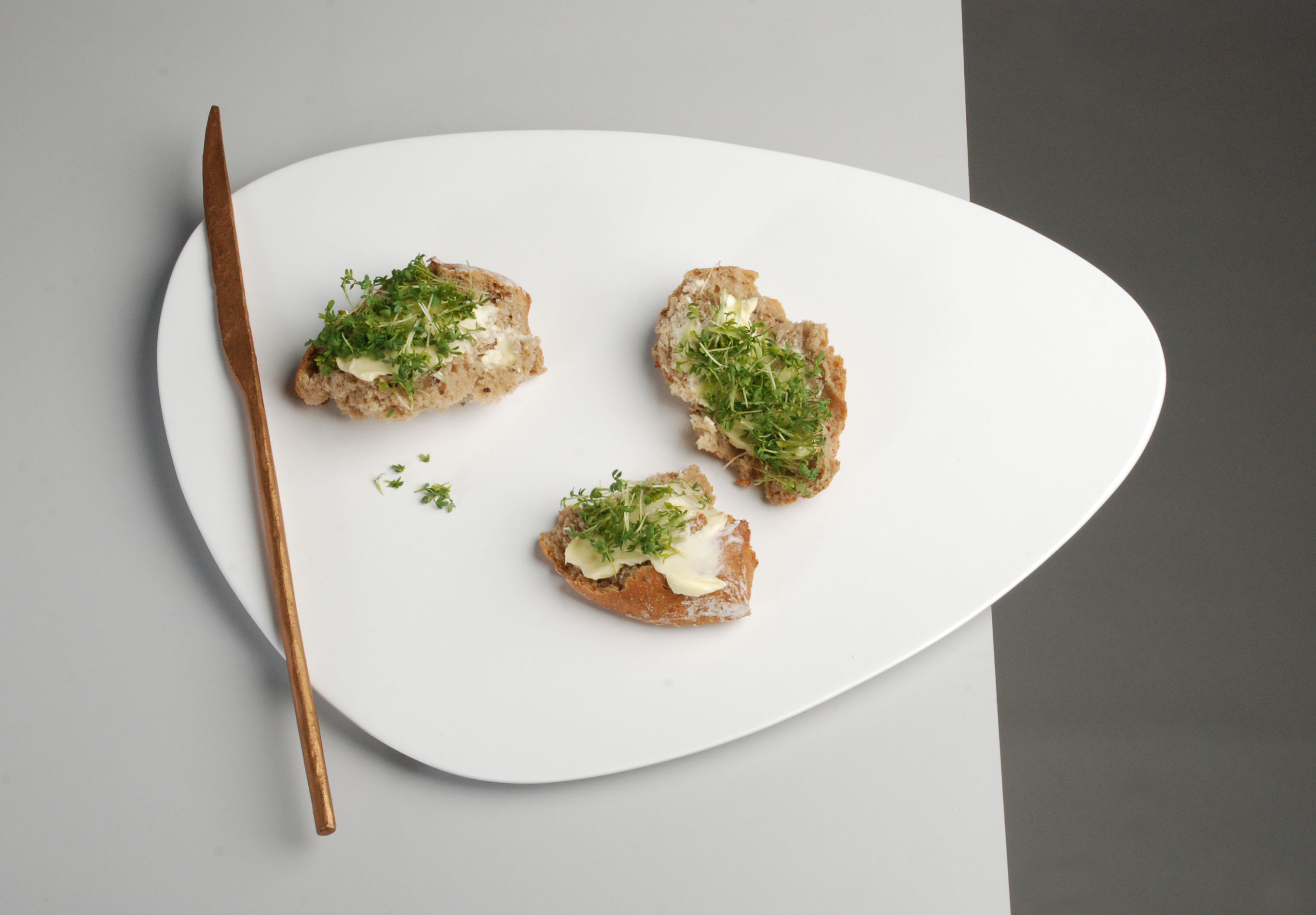 Die Form der Teller ergibt sich aus der Spannung zwischen Stillstand und Bewegung. Während die Oberseite aus einer Konkave mit leicht aufragendem Rand in eine gerade Fläche übergeht und so Arrangements für unterschiedliche Speisentypen zulässt, hebt die Unterseite als Antagonist die ganze Form