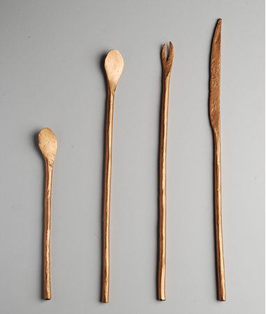 handgeschmiedete Besteck das Sinnerlebnis des Essens durch archaische Anleihen akzentuiert.